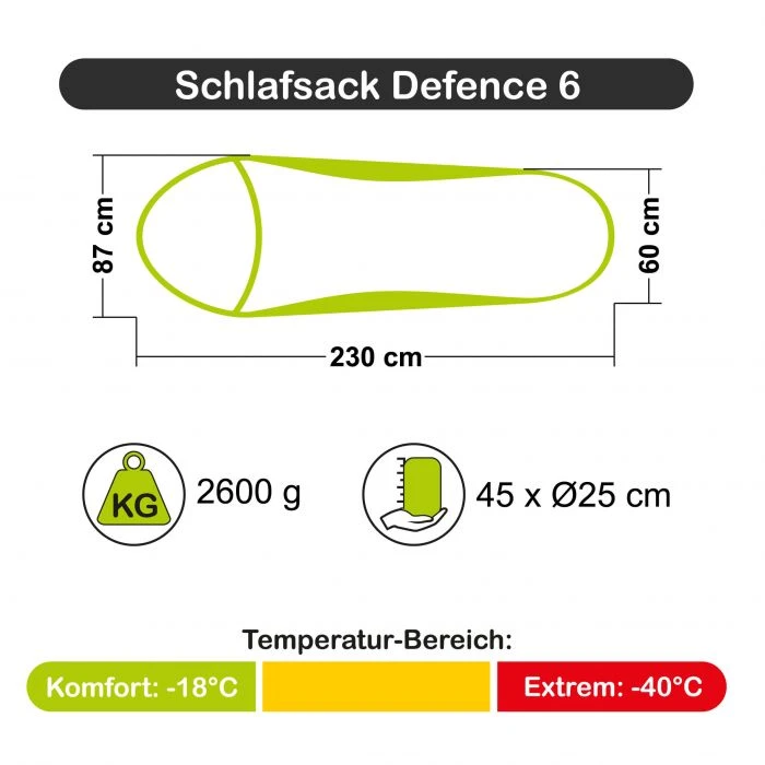 Der Defence 6 ist ein High-Performance Winterschlafsack für arktische Bedingungen mit einer kompromisslosen Wärmeleistung. Es hat eine dreilagige Sandwichkonstruktion mit einer locker sitzenden Außenhülle, die optimale Wärme garantiert. Die großzügige Zipper-Wärmeleiste an der Innenseite des Reißverschlusses verhindert jeglichen Wärmeverlust. Zusätzlich sorgt die RV-Abdecklasche an der Außenseite dafür, dass Wind und Nässe fern bleiben.