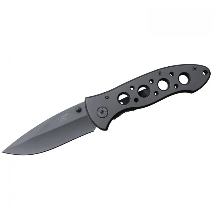 Das Ganzstahl-Messer aus dem Hause Herbertz kommt mit grau-schwarzem Design und coolen Aussparungen daher.
