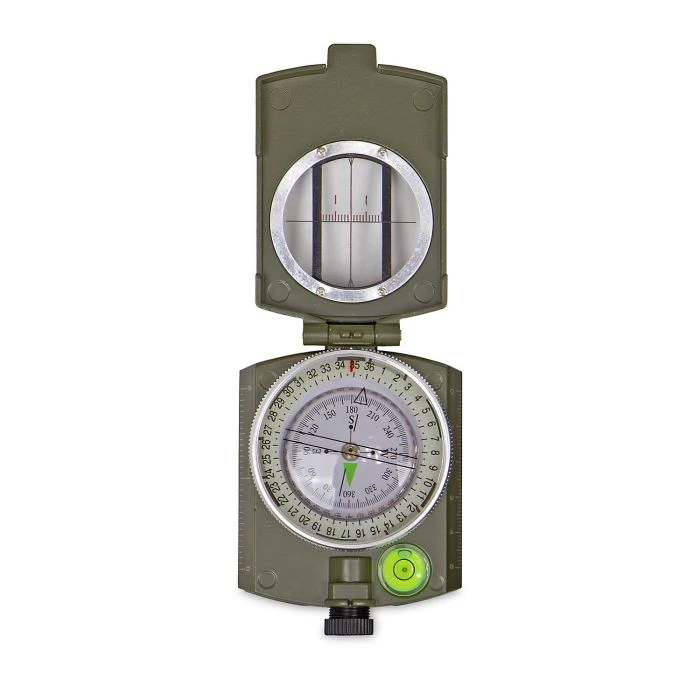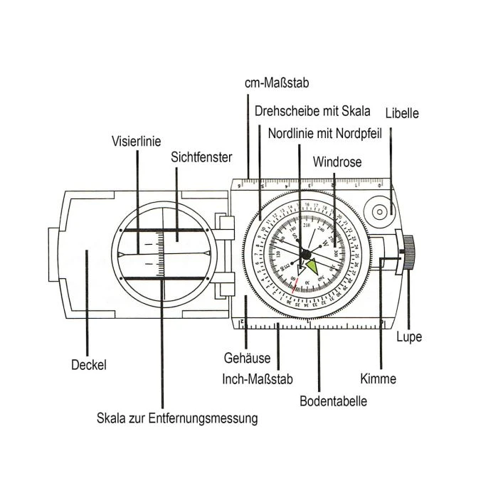 Dieser olivfarbene Metallkompass von Mil-Tec hat viele Funktionen: der Kompass ist flüssigkeitsgedämpft und besitzt im Deckel eine Visiereinrichtung, eine drehbare Skale, eine Anlegekante mit Maßstabseinteilung 1:25.000 sowie auf der Unterseite ein Gewinde, mit dem man den Kompass beispielsweise auf einem Stativ befestigen kann. Am Boden des Kompasses befindet sich eine Tabelle mit Umrechnungswerten von Winkeln in Steigungen und Entfernungen. Des Weiteren verfügt er über eine Wasserwaage und eine entnehmbare Lupe, mit der man zum Beispiel die Gradzahlen auf Karten gut ablesen kann. Der Armeekompass Metall m. Etui kann entweder an einer Kordel um den Hals getragen werden oder in der Tasche an Gürtel oder Ausrüstung befestigt werden.