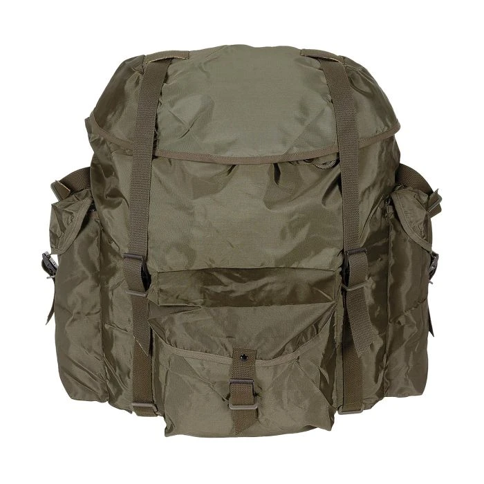 Gebrauchter Rucksack mit abnehmbarem Tragegestell und Polsterung, zwei seitlichen sowie einer vorderen aufgesetzten Außentasche. Der Boden ist mit verstärktem Nässeschutz versehen, außerdem verfügt der Rucksack über zwei Befestigungsriemen und einen Tragegriff.
