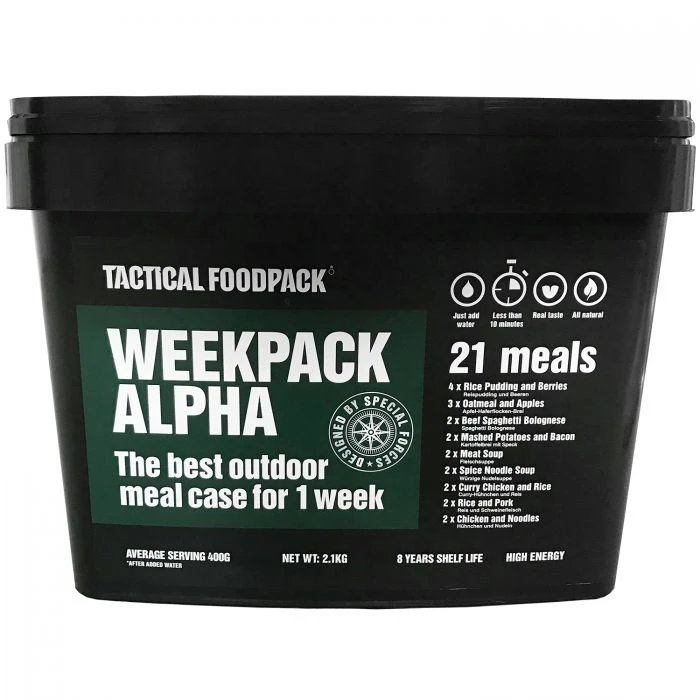 Die Gerichte von Tactical Foodpack sind genau das richtige, um auf einem anstrengendem Outdoor-Abenteuer wieder zu Kräften zu kommen. Die Wochenration „Alpha“ beinhaltet 21 Speisen und reicht für eine einwöchige Verpflegung (für eine Person) aus. Die nächste Outdoor-Tour kann also kommen!