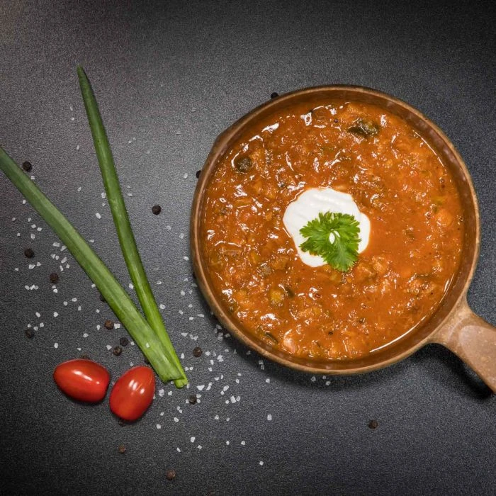 Fleischsuppe: Zutaten: Essiggurke. Zwiebeln, Schweinefleisch (20%), Tomatenpaste (Tomaten 30%, Wasser), Rapsöl, Zucker, Weizenmehl, Salz, Gewürze. Kann Spuren von Sellerie, Milch und Senf enthalten. Nährwertgehalt pro Portion (90g gefriergetrocknetes Produkt): Energie 1834 kJ/440 kcal; Fett 27,8 g; davon gesättigte Fettsäuren 6,9 g; Kohlenhydrate 22,5 g; davon Zucker 13,9 g; Ballaststoffe 5,5 g; Eiweiß 22,4 g; Salz 6,1 g Nährwertgehalt pro 100 g: Energie 2038 kJ/489 kcal; Fett 30,94 g; davon gesättigte Fettsäuren 7,67 g; Kohlenhydrate 25 g; davon Zucker 15,4 g; Ballaststoffe 6,1 g; Eiweiß 24,7 g; Salz 6,75 g