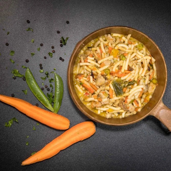 Nudelgericht mit Hähnchen: Zutaten: Nudeln (45%) (Weizenmehl, Wasser, Kurkuma), Hühnchen (15%), Karotten, Sahne, Kokosnussmilch, Mungo-Sprossen, Paprika, Zuckererbsen, Lauch, Erbsen, Pilze, Petersilie, Salz, Gewürze. Kann Spuren von Sellerie und Senf enthalten. Nährwertgehalt pro Portion (115g gefriergetrocknetes Produkt): Energie 1997 kJ/550 kcal; Fett 25,1 g; davon gesättigte Fettsäuren 15,6 g; Kohlenhydrate 53,1 g; davon Zucker 7,4 g; Ballaststoffe 5,8 g; Eiweiß 24,7 g; Salz 3,5 g Nährwertgehalt pro 100 g: Energie 1997 kJ/477 kcal; Fett 21,8 g; davon gesättigte Fettsäuren 13,6 g; Kohlenhydrate 46,2 g; davon Zucker 6,4 g; Ballaststoffe 5 g; Eiweiß 21,5 g; Salz 3,08 g