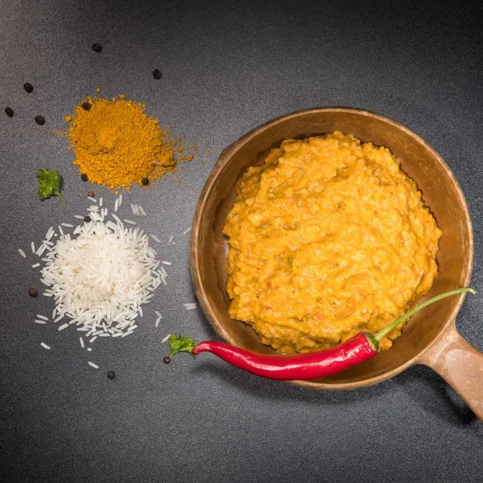 Reiscurry mit Hähnchen: Zutaten: Reis (40%), Hähnchenbrustfilet (17%), Sahne, Hühnerbouillon, Rapsöl, Tomaten, Paprika, Currypaste, Kräuter, Gewürze, Salz. Kann Spuren von Sellerie und Senf enthalten. Nährwertgehalt pro Portion (100g): Energie 2108 kJ/500 kcal; Fett 28,6 g; davon gesättigte Fettsäuren 9,5 g; Kohlenhydrate 40,8 g; davon Zucker 3,9 g; Ballaststoffe 2 g; Eiweiß 22,4 g; Salz 2,2 g Nährwertgehalt pro 100 g: Energie 2108 kJ/500 kcal; Fett 28,6 g; davon gesättigte Fettsäuren 9,5 g; Kohlenhydrate 40,8 g; davon Zucker 3,9 g; Ballaststoffe 2 g; Eiweiß 22,4 g; Salz 2,2 g