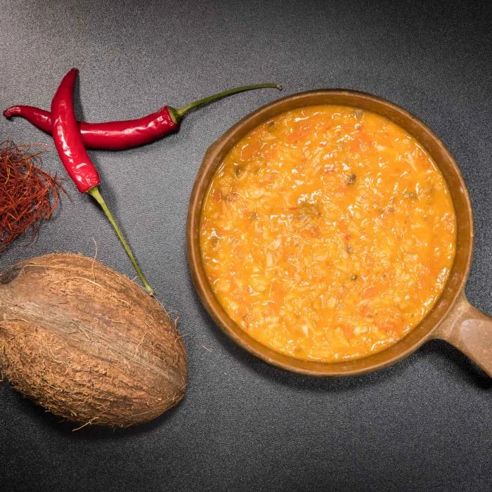Würzige Nudelsuppe: Zutaten: Nudeln (20%) (Weizenmehl, Wasser, Kurkuma), Hähnchenbrustfilet (17%), Karotten, Kokosnussmilch, Champignons, gehackte Tomaten, Tomaten, Gewürze, Salz. Kann Spuren von Sellerie und Senf enthalten. Nährwertgehalt pro Portion (70g gefriergetrocknetes Produkt): Energie 1453 kJ/346 kcal; Fett 16,6 g; davon gesättigte Fettsäuren 5,7 g; Kohlenhydrate 31 g; davon Zucker 5,6 g; Ballaststoffe 4,1 g; Eiweiß 18,2 g; Salz 3,3 g Nährwertgehalt pro 100 g: Energie 2075 kJ/494 kcal; Fett 23,7 g; davon gesättigte Fettsäuren 8,2 g; Kohlenhydrate 44,3 g; davon Zucker 8 g; Ballaststoffe 5,9 g; Eiweiß 25,9 g; Salz 4,8 g